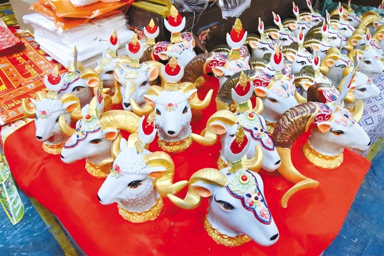 “隆果”也只在藏歷新年前出售,是藏歷新年必備的年貨之一,從新年的初一到十五期間擺放在家里,其余時間,即便是在常年熱鬧的沖賽康市場也很難尋見,所以當看到塑彩羊頭時,也就代表年關(guān)將至。