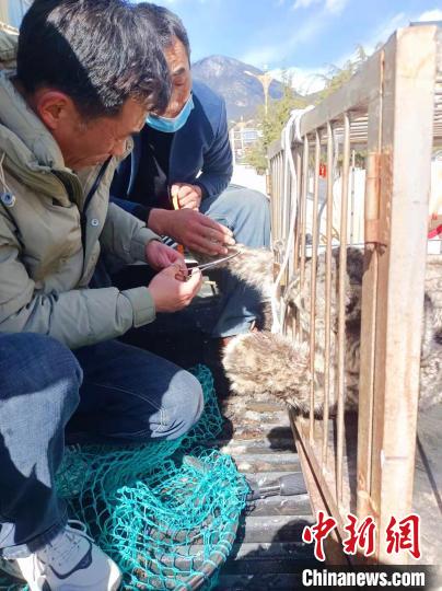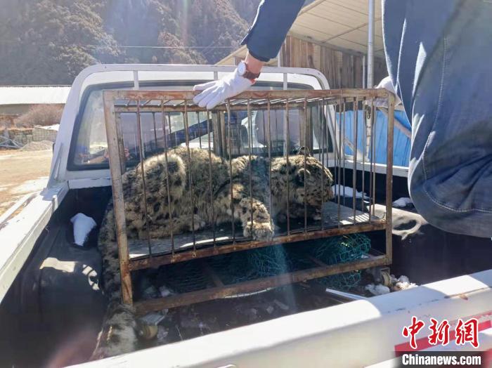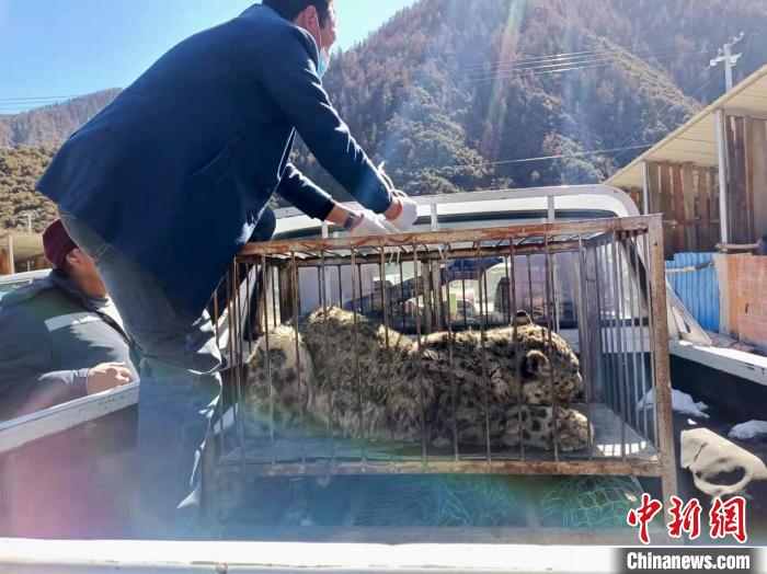 圖為工作人員將雪豹運送至林芝市野生動物收容救護站。 林芝市林草局供圖