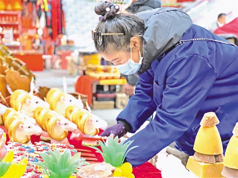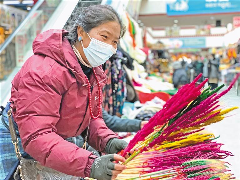 在雪域亙古浩瀚的歷史中,高原兒女自古以來便認定“羊”是吉祥的動物,代表了藏族群眾祈盼來年五谷豐登、六畜興旺。塑彩羊頭在藏語中稱為“隆果”,一般擺放在新年布置的貢品中央?!鞍謰屓ツ曩徺I了一種用石灰制作的塑彩羊頭,今年我想購買陶瓷制作的塑彩羊頭放在爸媽家,去年買的拿回自己家,這樣既環(huán)保,也讓老人開心。”市民索朗旺堆在年貨攤位購買“隆果”時說。
