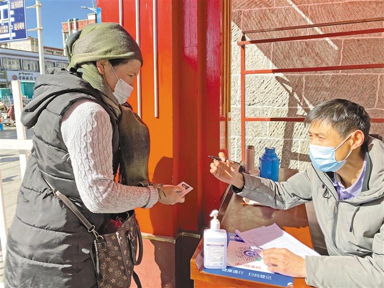 八廓商城市場部部長卓嘎介紹說:“為廣大市民提供一個安全、祥和的購物環(huán)境,我們在商場設有5個進出口,每個進出口都需掃行程碼、測量體溫后才可進入。因為有些老人沒有智能手機,無法掃健康瑪,我們會登記姓名、身份證號、聯(lián)系方式。并且在增加的攤位旁增設消防器材,不定時巡邏。”