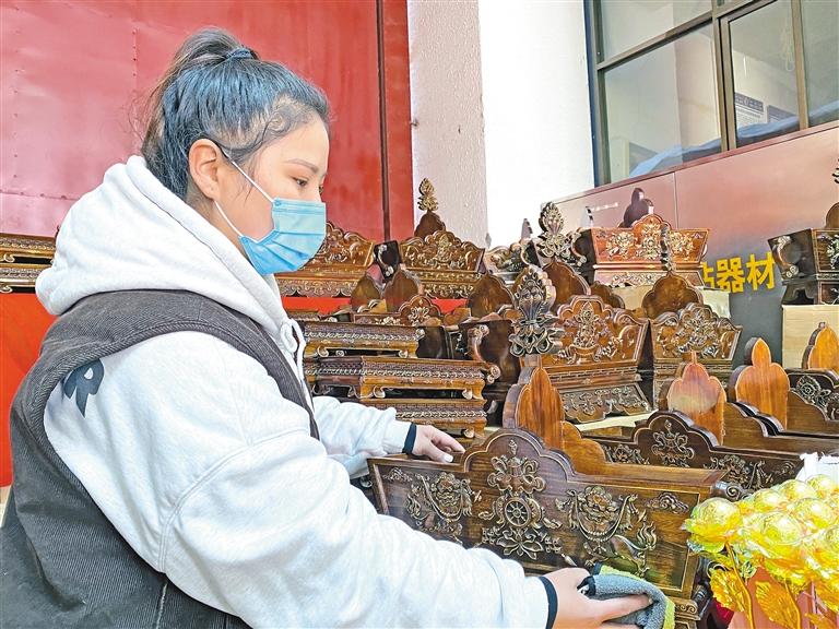 來自山南市貢嘎縣的拉吉帶著自家生產(chǎn)的“切瑪盒”第2次來到八廓商城年貨市場?!坝捎谑亲约疑a(chǎn),所以我們自主設計了一款線條稍微簡約的‘切瑪盒’;還有一款傳統(tǒng)線條與圖案的‘切瑪盒’。在顏色上,我們選擇了較為持重的深色,這樣的顏色大氣沉穩(wěn),許多市民非常喜歡,兩款售價都是380元。”拉吉介紹道。
