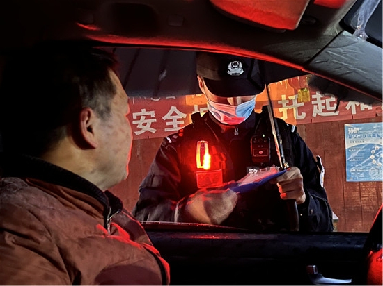 圖為林芝達(dá)國橋邊境檢查站民警元宵節(jié)當(dāng)晚在執(zhí)勤點(diǎn)檢查車輛。 姜凱峰 攝