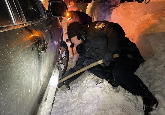 在到達(dá)現(xiàn)場后,救援民警立即為早已凍得瑟瑟發(fā)抖的被困人員送上了熱水和防寒大衣,并安撫了被困人員情緒。在勘察了現(xiàn)場的情況后,救援民警一邊用鐵鍬和雙手迅速清理車輛底盤的厚冰,一邊用牽引繩嘗試將被困車輛進(jìn)行拉出,因積雪太厚嘗試多次未能成功,隨后,協(xié)調(diào)到朗縣養(yǎng)護(hù)段一輛推土機(jī),經(jīng)過一個小時救援,被困車輛成功被拖出。被困人員救出來后,為了確保車輛人員的絕對安全,金東邊境派出所救援民警全力護(hù)送被困人員于晚上11點(diǎn)45分安全抵達(dá)單位營區(qū),救援工作取得圓滿成功。