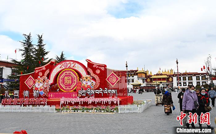 2月26日,人們經過大昭寺廣場擺放著的慶祝新年裝置。隨著藏歷新年日益臨近,拉薩街頭年味濃郁。 中新社記者 趙朗 攝