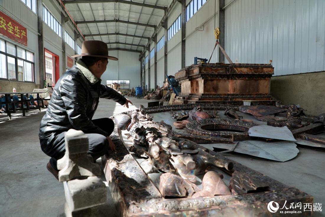 工廠內傳承人羅布占堆講述鍛銅制作過程。人民網 次仁羅布攝