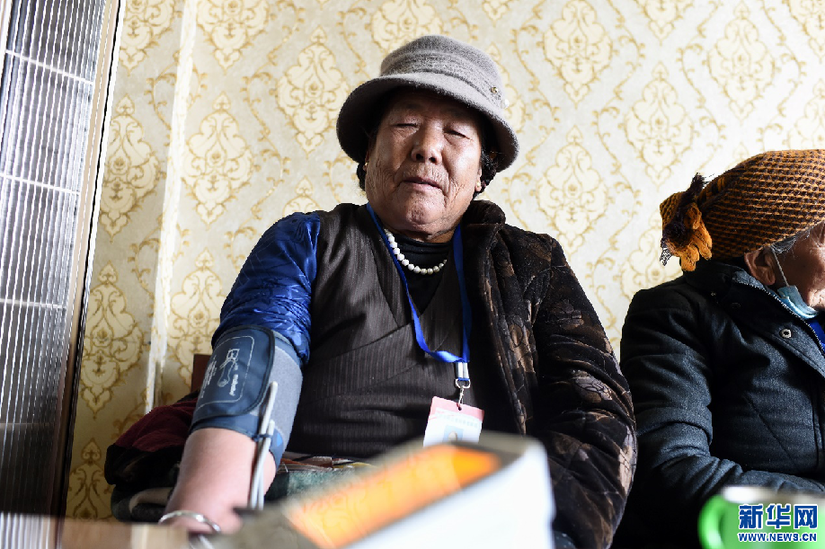 2月24日,白瑪老人在養(yǎng)老驛站測血壓。新華網 旦增努布 攝