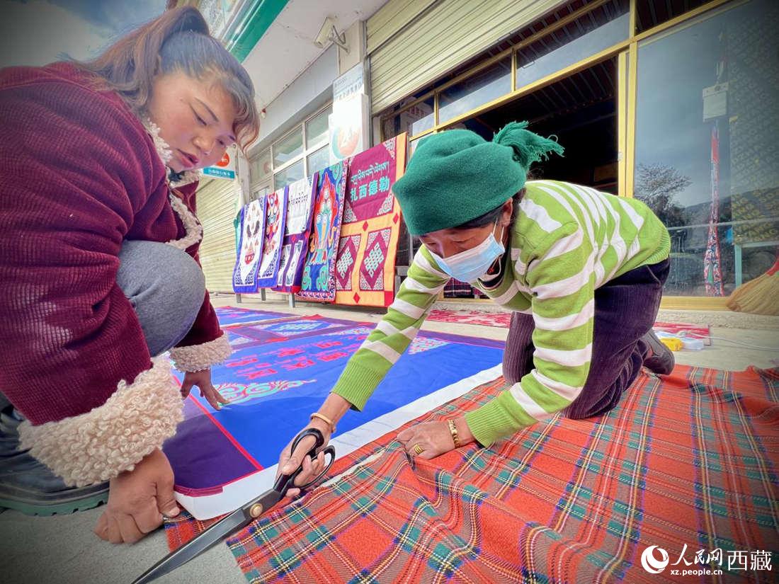 農牧民專業(yè)合作社里的村民正在制作門簾。人民網 次仁羅布攝