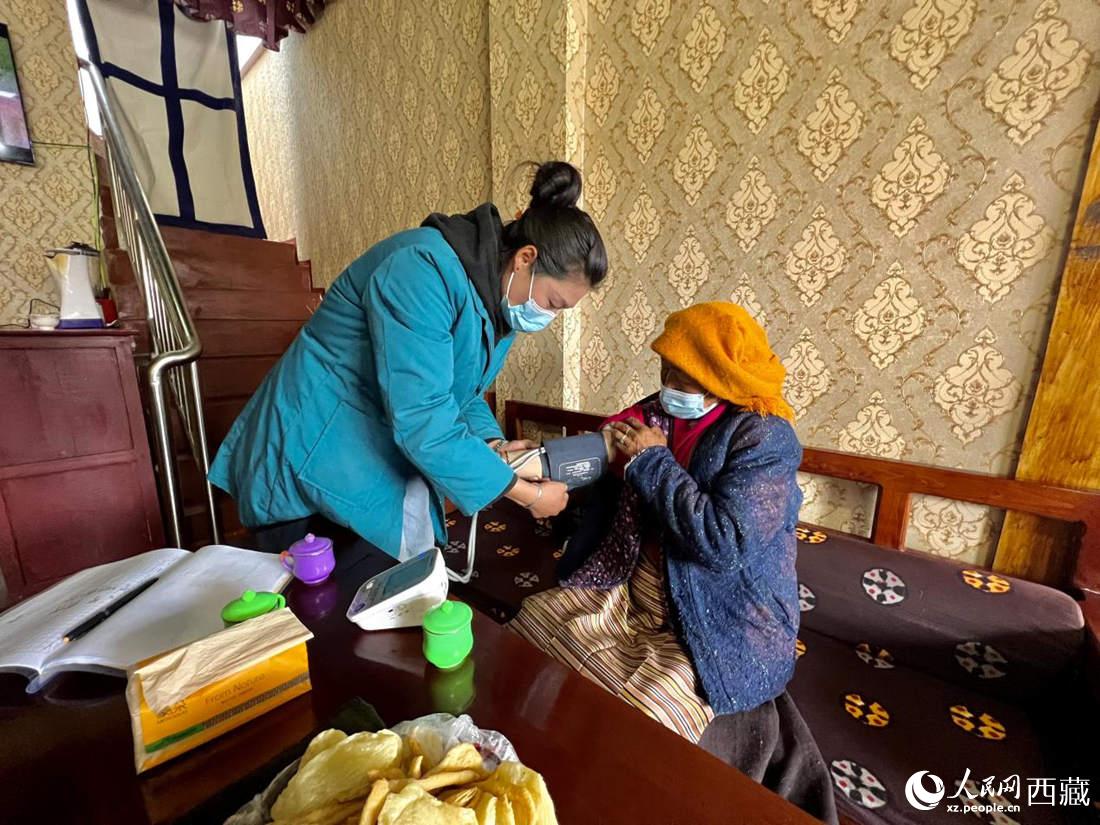 醫(yī)護人員為老人定期測量血壓。人民網 次仁羅布攝