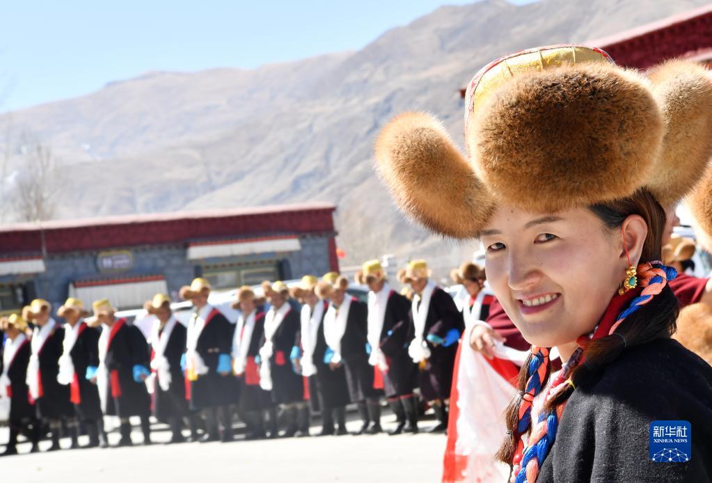 3月3日,西藏山南市貢嘎縣崗堆鎮(zhèn)農(nóng)民穿著嶄新的氆氌藏裝參加藏歷新年活動(dòng)。新華社記者 覺(jué)果 攝