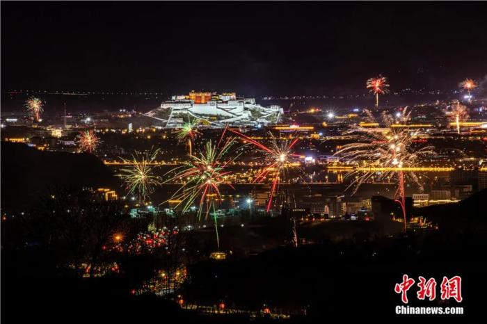 2021年2月10日晚,藏歷新年辭舊迎新“古突”夜,拉薩夜空煙花璀璨。當(dāng)日是藏歷12月29日,自此,藏族民眾一年中最隆重的節(jié)日——藏歷新年的一系列活動正式拉開序幕。中新社記者 何蓬磊 攝