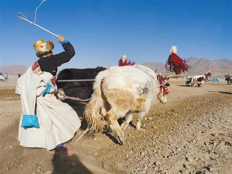 桑珠孜區(qū)曲美鄉(xiāng)拉貴村村民在揚鞭犁地。記者 扎西頓珠 攝