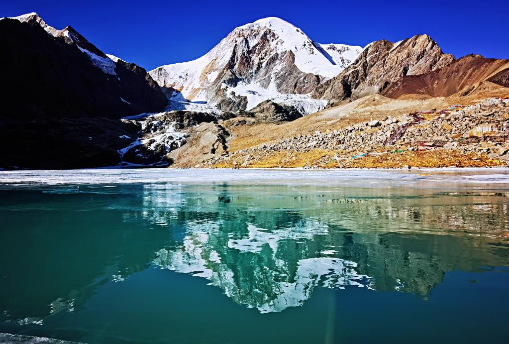 2022年3月27日拍攝的窮母崗日峰在冰湖上的倒影。(手機(jī)照片,新華社記者 沈虹冰 攝)