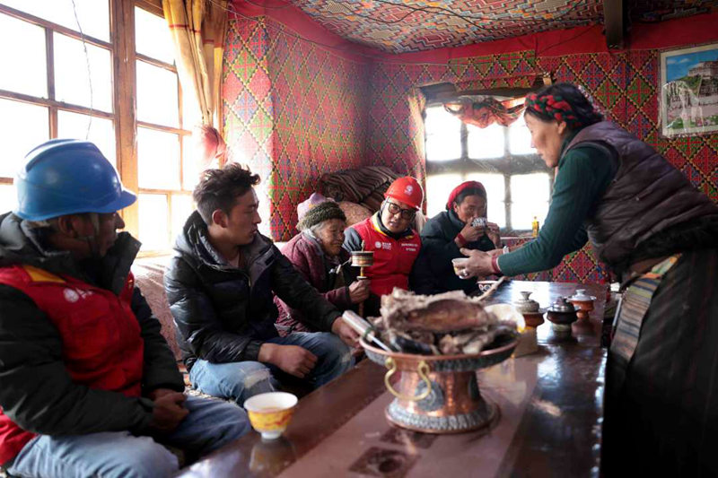 國網(wǎng)墨竹工卡縣供電公司員工與讓桌家人一起談?wù)撝?。閆昱翰攝