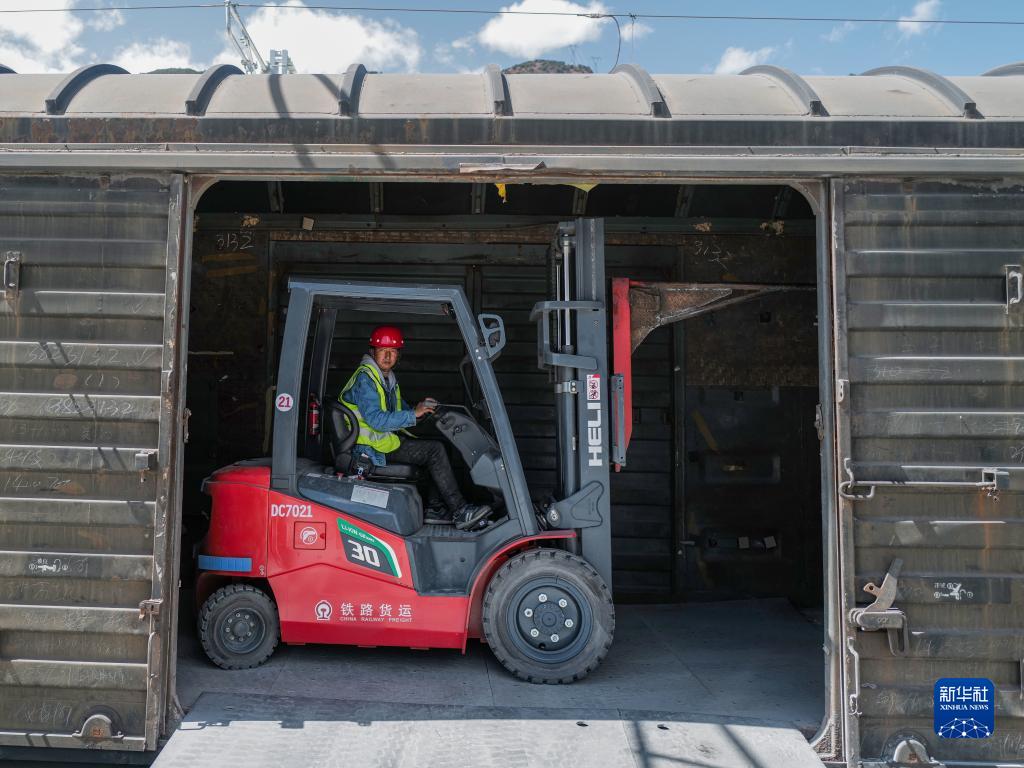 林芝市巴宜區(qū)布久鄉(xiāng)朵當(dāng)村村民邊巴在林芝站貨場(chǎng)駕駛叉車(3月29日攝)。新華社記者 洛卓嘉措 攝