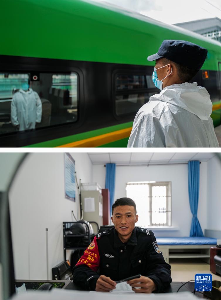 拼版照片:上圖為3月31日,白瑪旺扎在列車即將駛離車站時(shí)執(zhí)勤(新華社記者洛卓嘉措攝);下圖為白瑪旺扎在派出所接待窗口(新華社記者劉潁攝)。今年24歲的白瑪旺扎2021年8月起在林芝站派出所擔(dān)任輔警,他的家位于離車站3公里的麥巴村。鐵路的開通讓他解決了就業(yè),同時(shí)還能照顧家庭。新華社發(fā)