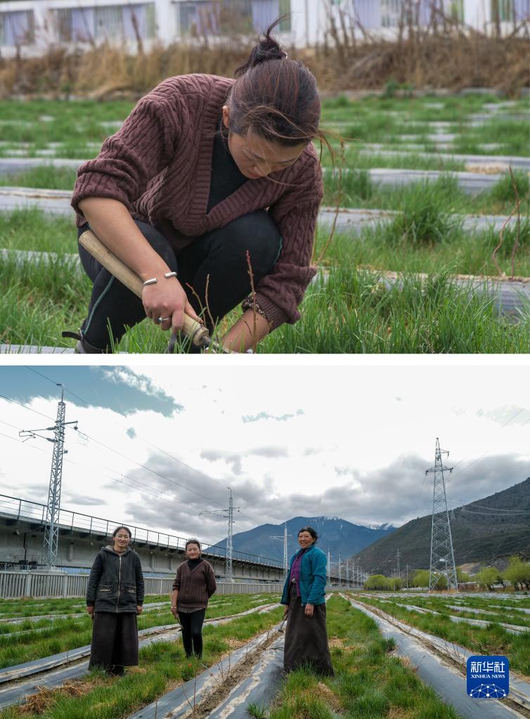 拼版照片:上圖為3月30日,尼瑪?shù)录谒{(lán)莓種植基地工作;下圖為尼瑪?shù)录ㄖ校┘巴抡驹谒{(lán)莓種植基地中,背后是鐵路橋。麥巴村村民尼瑪?shù)录衲陝倽M20歲,此前在林芝巴宜區(qū)一家藏餐館打工,后來回到村里設(shè)立的藍(lán)莓種植基地工作。尼瑪?shù)录f,能在家門口工作令她很開心,她每天都能看到火車從旁邊經(jīng)過,希望有一天也能坐上火車去拉薩逛一逛。新華社記者 洛卓嘉措 攝