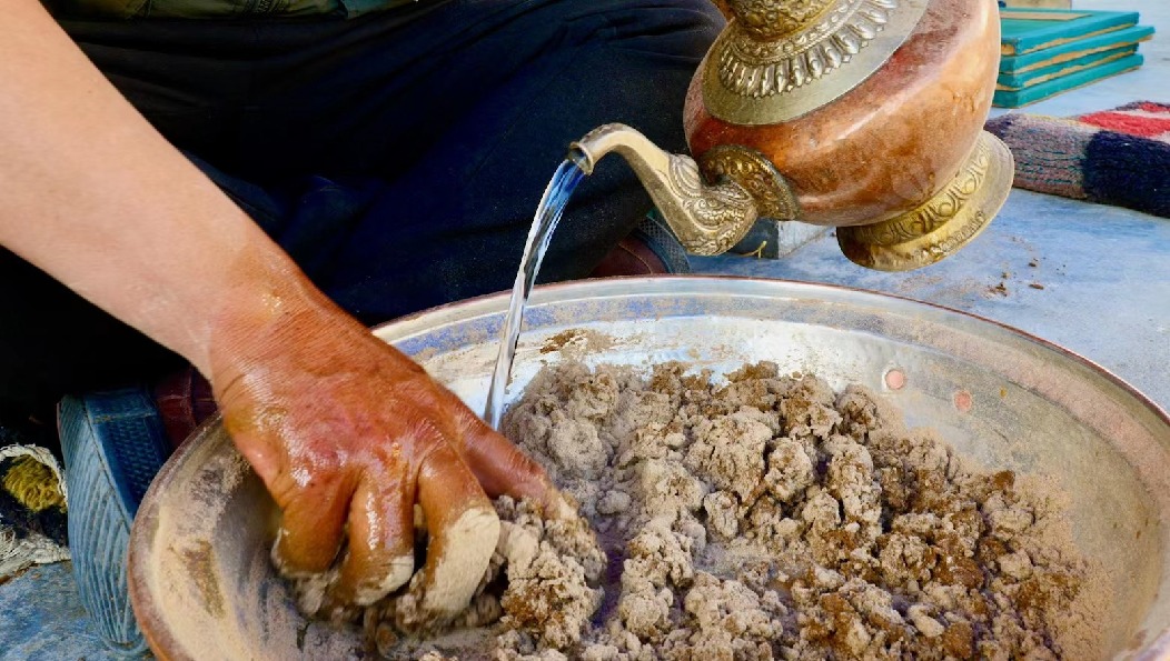 靜謐的午后,空氣里都是柏木的清香。次仁多吉盤坐在遮陽傘下,伴著周圍清脆的流水、水磨聲,輕揉著手中的香泥。隨后他用手一抓,迅速將香泥擠進帶孔的牛角器中,身子微微前傾,手指用上巧勁,一根根藏香便排在紗網(wǎng)之上。