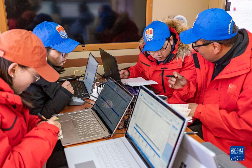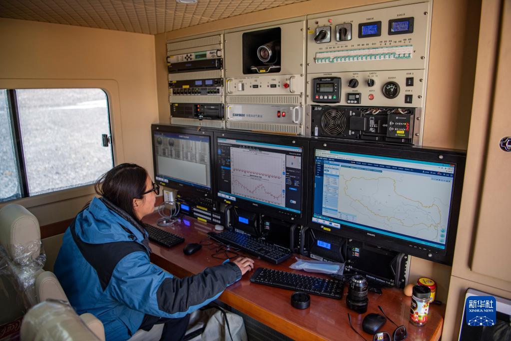 在珠峰登山大本營的氣象應(yīng)急保障車內(nèi),西藏自治區(qū)氣象局工作人員在查看實(shí)時(shí)氣象數(shù)據(jù)(5月3日攝)。新華社記者 孫非 攝
