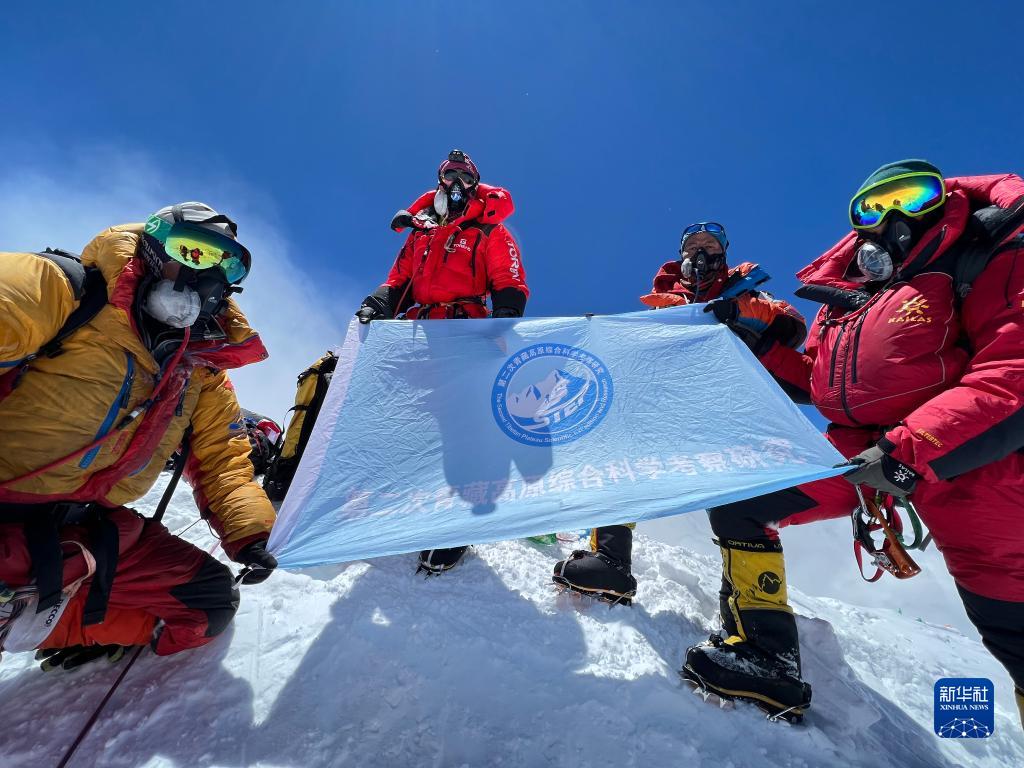 5月4日,在珠穆朗瑪峰頂,科考隊(duì)員正在展示第二次青藏高原綜合科學(xué)考察研究旗幟。新華社特約記者 索朗多吉 攝