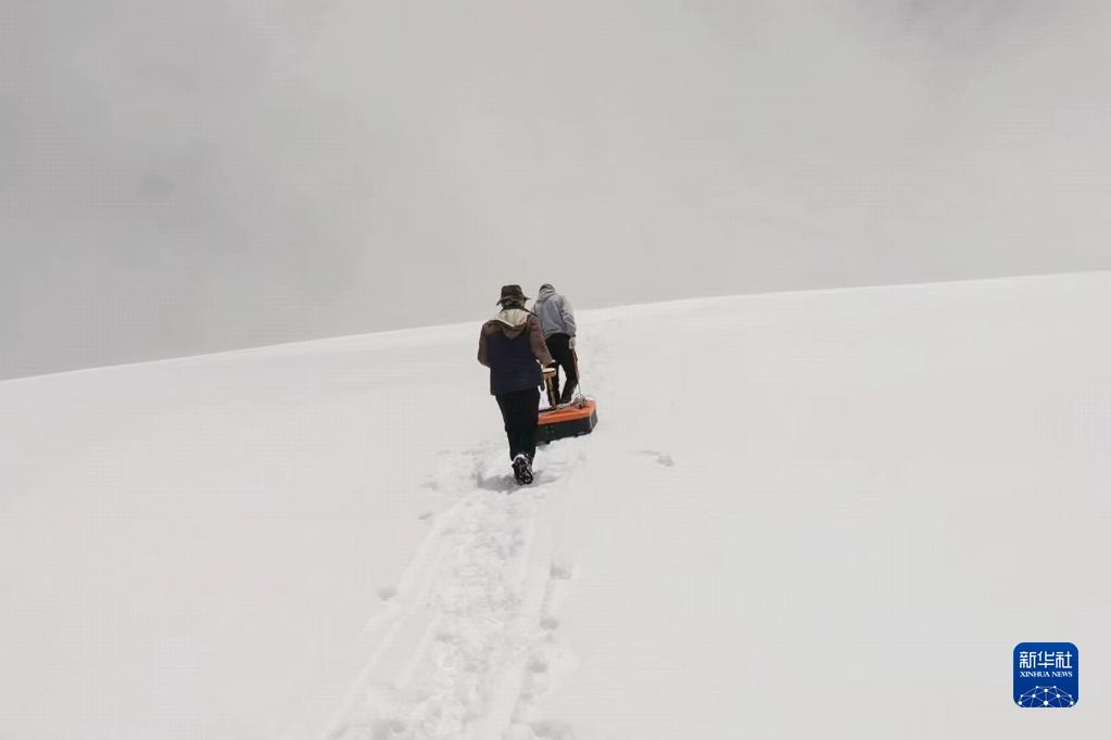 與此同時,科研人員拖著冰川雷達測厚儀,在東絨布冰川表面沿著“Z”字形軌跡,向下發(fā)送探測波獲取厚度數(shù)據(jù)。