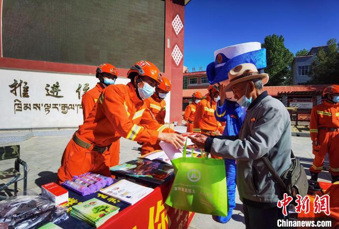 圖為消防指戰(zhàn)員給市民發(fā)放防火宣傳手冊(cè)。 洛桑頓珠 攝