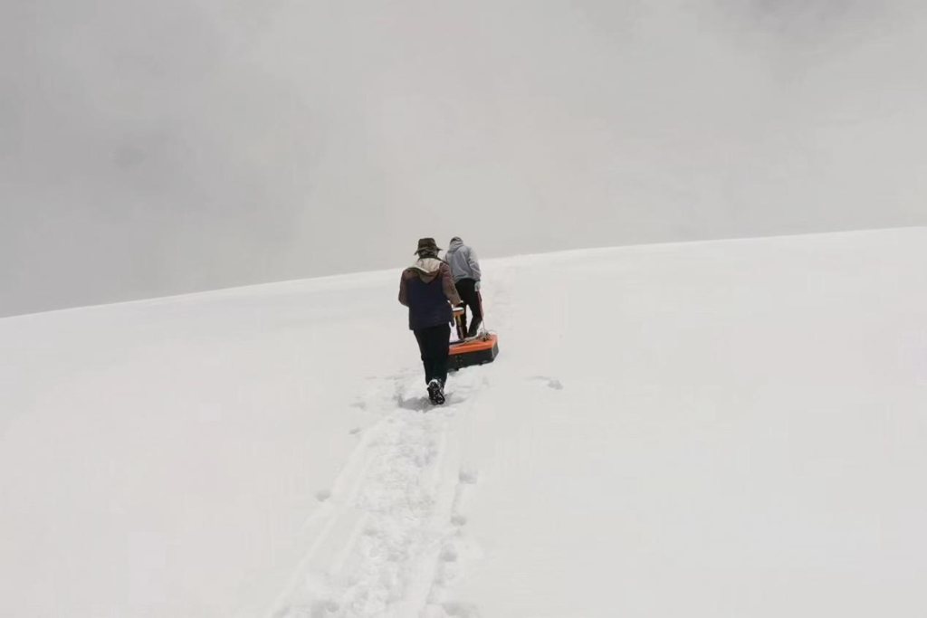 科考隊(duì)員拉著冰川雷達(dá)測厚儀開展測量工作。新華社發(fā)