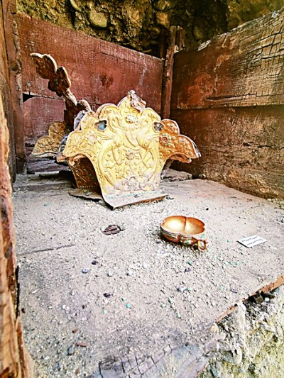 烏蘭泉溝吐蕃壁畫墓暗格木箱內(nèi)鎏金王冠和金杯。資料圖片