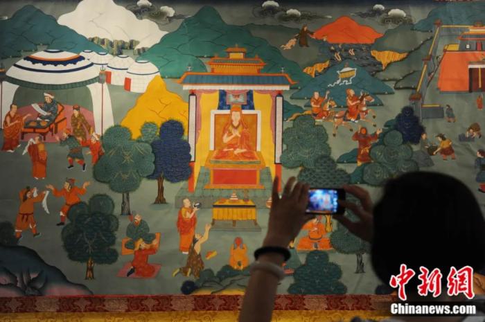 手繪大型歷史題材卷軸唐卡《涼州會盟》。中新社記者 楊艷敏 攝