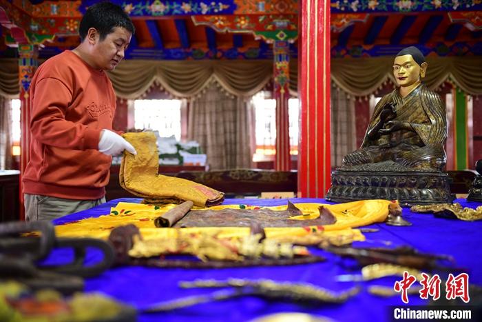 圖為捐贈者洛桑旦增正在整理文物。 中新社記者 貢嘎來松 攝