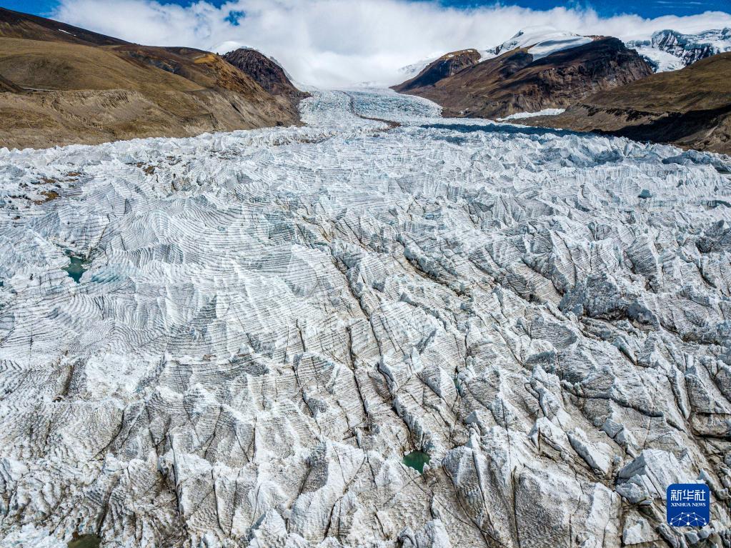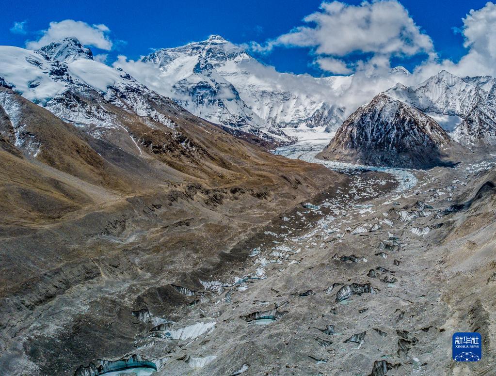 這是5月8日在西藏日喀則市拍攝的珠穆朗瑪峰腳下的絨布冰川(無人機(jī)照片)。新華社記者 田金文 攝