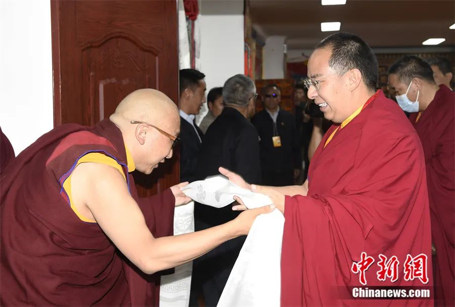 6月2日,班禪與藏傳佛教噶舉派高僧座談前,噶舉派高僧向班禪(圖右)敬獻(xiàn)哈達(dá)。中新社發(fā) 李林 攝