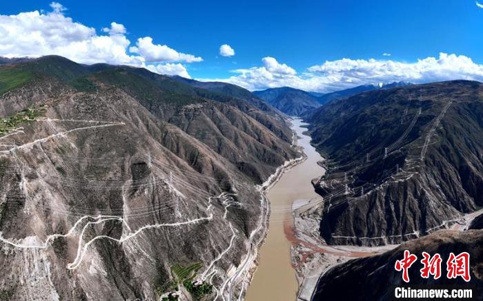 蘇洼龍水電站500千伏送出工程(中)與川藏聯(lián)網(wǎng)鏈路(兩側)并行跨越金沙江大峽谷。 劉湘釩 攝