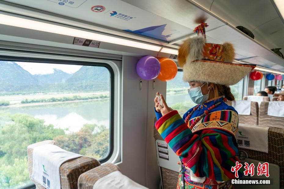 圖為當(dāng)日,西藏拉林鐵路通車一周年活動(dòng)上,那曲安多牧民德吉次仁身著傳統(tǒng)盛裝首次體驗(yàn)高原復(fù)興號(hào),在進(jìn)入林芝后記錄“雪域江南”風(fēng)光。 中新社記者 江飛波 攝