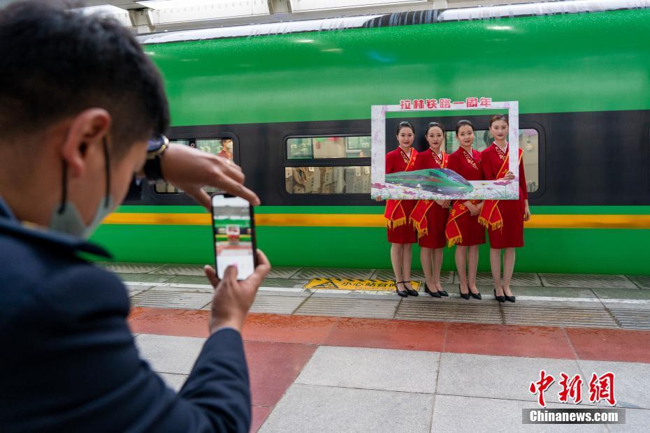 圖為當(dāng)日清晨,拉薩火車站,C881次列車出發(fā)前,“動(dòng)姐”們?cè)诟咴瓘?fù)興號(hào)前合影留念,紀(jì)念拉林鐵路通車一周年。 中新社記者 江飛波 攝