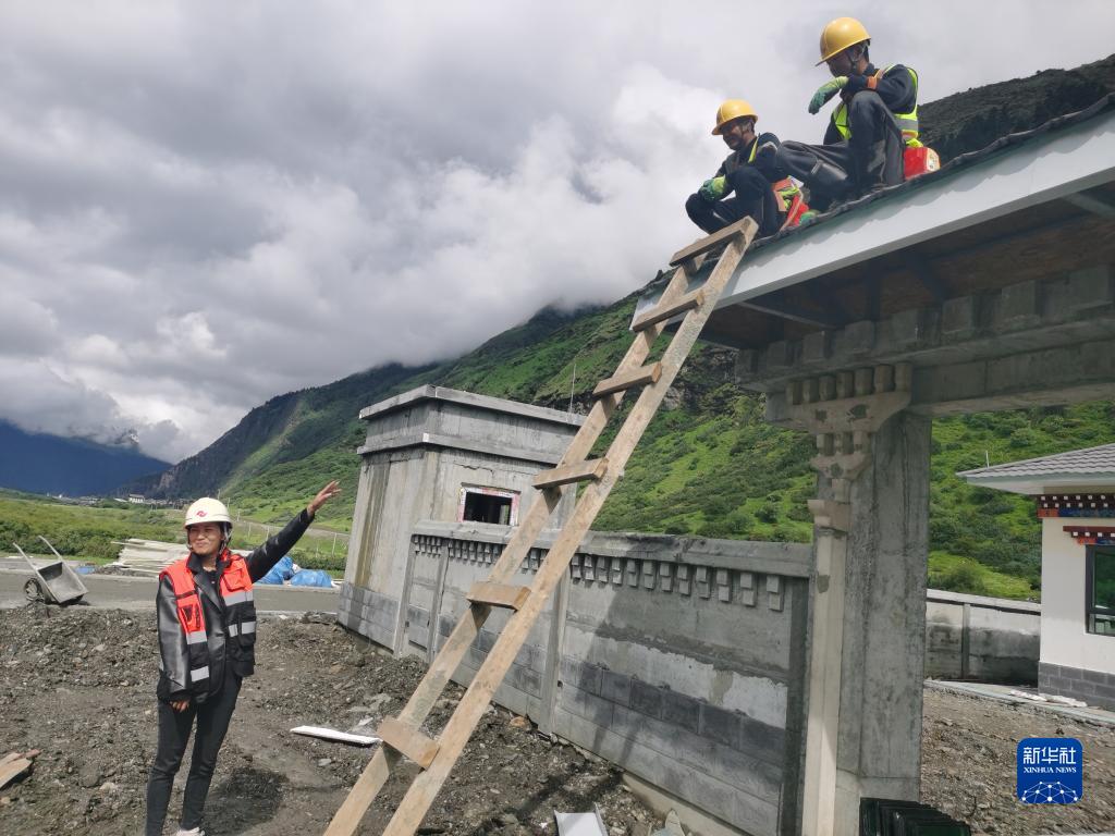 “格桑花開”大學(xué)生就業(yè)創(chuàng)業(yè)特訓(xùn)營學(xué)員、西藏藏建科技股份有限公司職員阿吉卓瑪(左)在施工現(xiàn)場工作(2022年6月28日攝)。