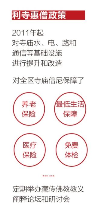 西藏出臺(tái)了一系列利寺惠僧政策,對(duì)全區(qū)寺廟僧尼保障了養(yǎng)老保險(xiǎn)、最低生活保障、醫(yī)療保險(xiǎn)、重大疾病醫(yī)療保險(xiǎn)、免費(fèi)體檢等。同時(shí)定期舉辦藏傳佛教教義闡釋論壇和研討會(huì),鼓勵(lì)藏傳佛教界代表人士對(duì)藏傳佛教經(jīng)典教義作出符合國家法律法規(guī)、社會(huì)主義核心價(jià)值觀和中華優(yōu)秀傳統(tǒng)文化精神的新闡釋,藏傳佛教中國化邁出了新步伐。