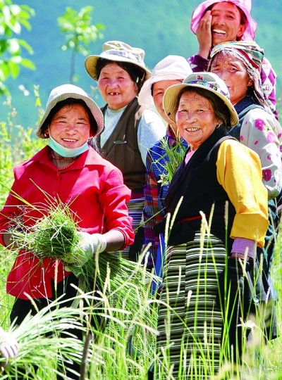 西藏加查縣共康村村民互助組在割草,為過冬的牛羊儲備飼料。郭紅松攝/光明圖片