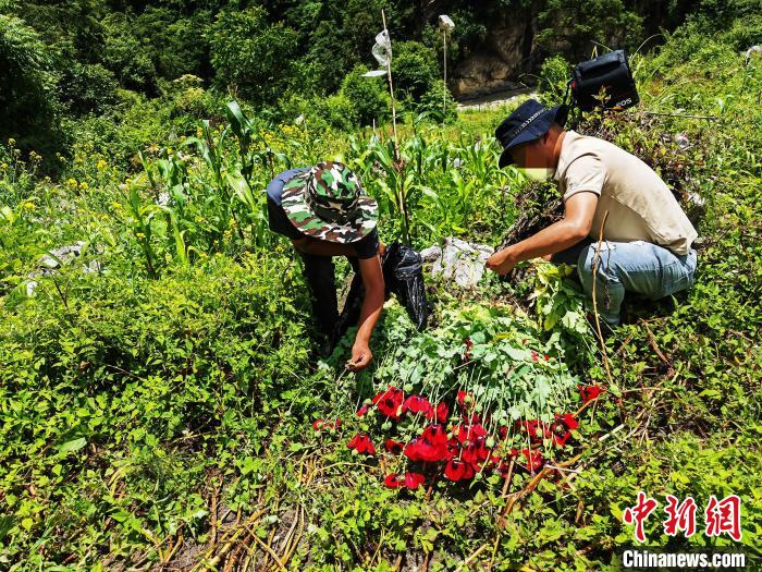 圖為民警鏟除野生罌粟現場?!∪湛t市公安局禁毒支隊供圖