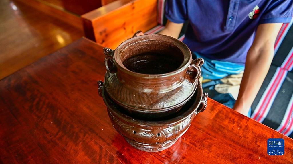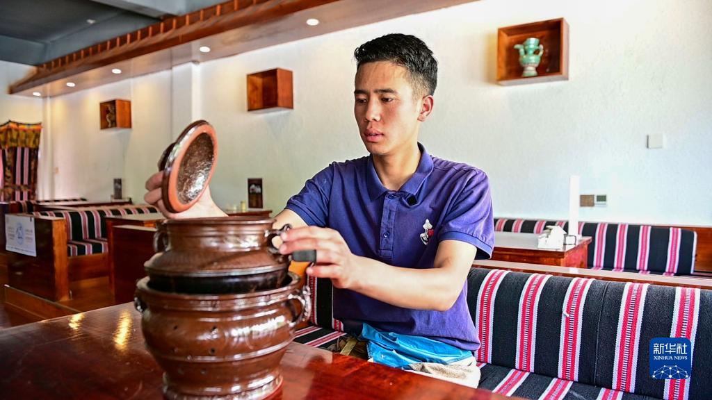在拉薩市墨竹工卡縣,洛桑益西在自己開的藏餐店內展示作為藏式牛肉湯容器的塔巴陶瓷(6月23日攝)。新華社記者 周荻瀟 攝