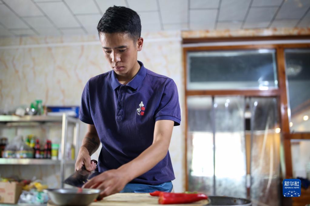 在拉薩市墨竹工卡縣,洛桑益西在自己開的藏餐店切菜備料(6月23日攝)。新華社記者 姜帆 攝