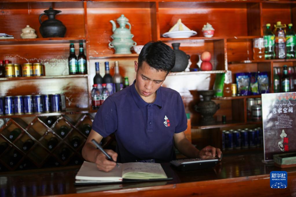在拉薩市墨竹工卡縣,洛桑益西在自己開的藏餐店內算賬(6月23日攝)。新華社記者 姜帆 攝