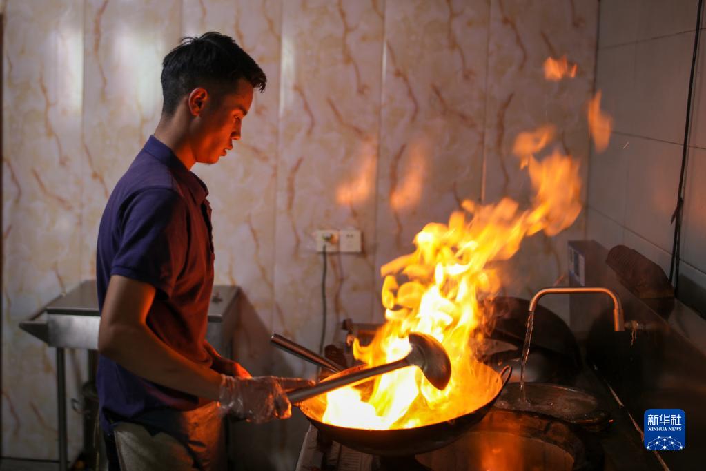 在拉薩市墨竹工卡縣,洛桑益西在自己開的藏餐店內炒菜(6月23日攝)。新華社記者 姜帆 攝