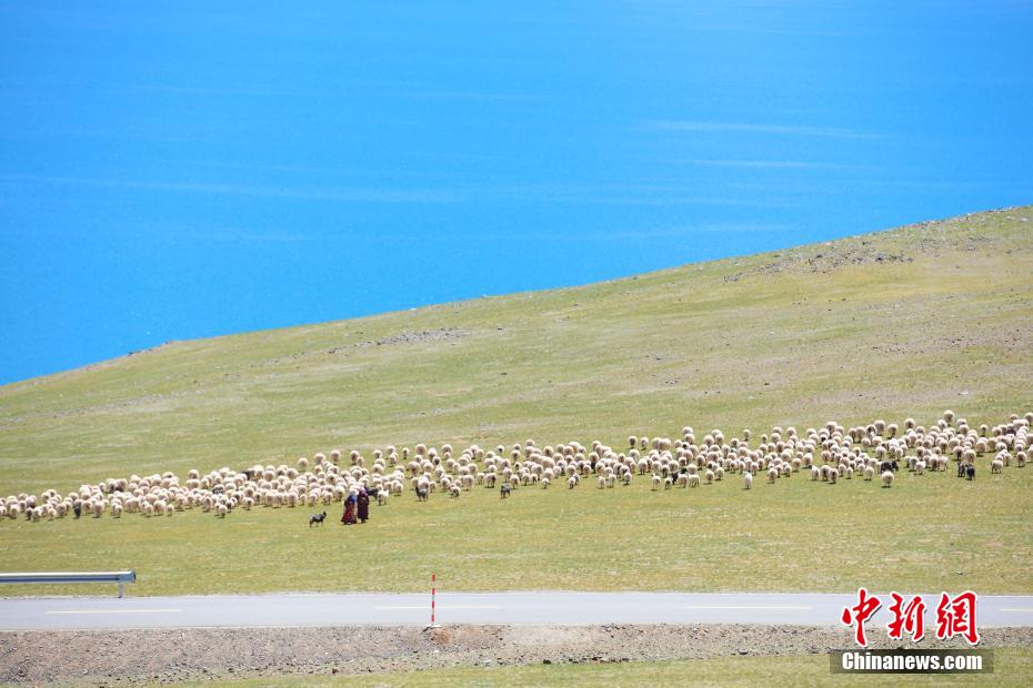 羌塘草原位于西藏自治區(qū)北部,平均海拔超過4600米,進入夏季后,羌塘草原上的雨水多起來了,水草也更加豐茂了。這里湖泊星羅棋布,還有浩瀚的草原和冰川、溫泉。野牦牛、藏羚羊、藏原羚、藏野驢等珍稀野生動物與雪山、草地、藍天、白云,構成撼人心魄的壯美畫面。圖為西藏那曲市班戈縣牧民在湖邊放羊。 貢嘎來松 攝