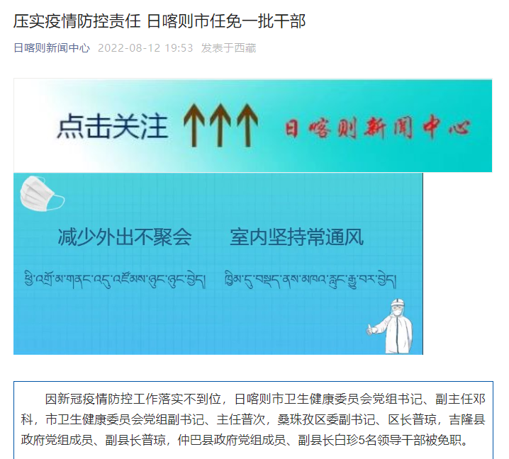 據(jù)日喀則新聞中心微信公眾號(hào)消息,因新冠疫情防控工作落實(shí)不到位,日喀則市衛(wèi)生健康委員會(huì)黨組書記、副主任鄧科,市衛(wèi)生健康委員會(huì)黨組副書記、主任普次,桑珠孜區(qū)委副書記、區(qū)長(zhǎng)普瓊,吉隆縣政府黨組成員、副縣長(zhǎng)普瓊,仲巴縣政府黨組成員、副縣長(zhǎng)白珍5名領(lǐng)導(dǎo)干部被免職。
