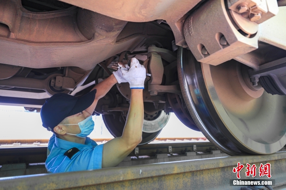 8月17日,北京車輛段北京西庫檢車間內(nèi),檢修人員對時速160公里動力集中型復(fù)興號動車組(俗稱“綠巨人”)的走行部進行檢修。這里是京津冀地區(qū)唯一的“綠巨人”檢修維修基地,肩負著18列共計261節(jié)車輛的檢修任務(wù)。隨著暑運逐漸迎來返校返程高峰,檢修人員也在加班加點為列車做好體檢工作,確保運行安全。 中新社記者 賈天勇 攝