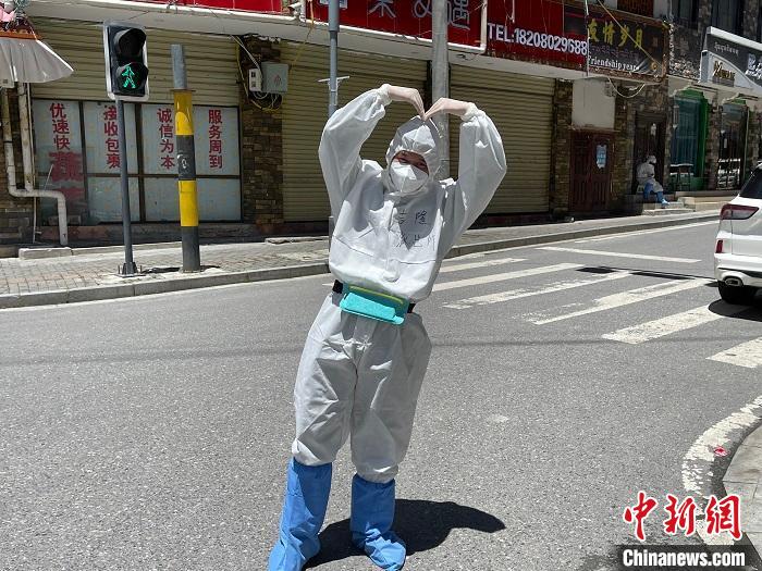 民警賀東在做好自身防護(hù)的前提下不停巡邏排查,一轉(zhuǎn)就是8個(gè)小時(shí)。他為民眾、游客及工人聯(lián)系購買生活物資、煤氣等。汗水浸濕在口罩里,不到一會(huì),“大白”就能“喝”到自己的汗水。