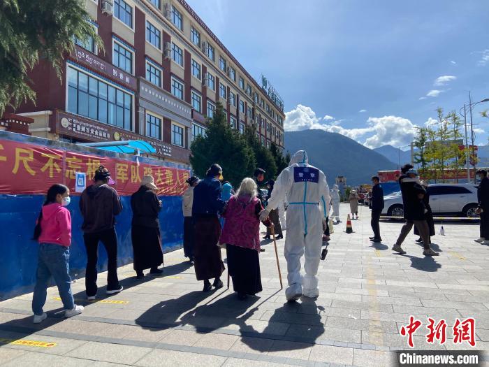圖為林芝邊境管理支隊(duì)輪訓(xùn)隊(duì)民警孫震正攙扶行動(dòng)不便的老人前往核酸檢測(cè)點(diǎn)。任遠(yuǎn)波 攝
