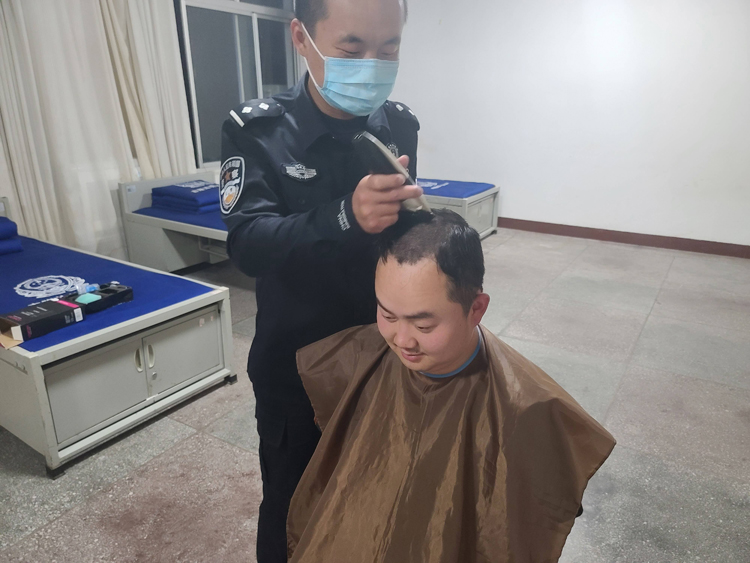在隔離酒店執(zhí)勤的副所長(zhǎng)王士博,在完成工作后請(qǐng)同事幫忙給自己剃了個(gè)光頭,“當(dāng)前疫情防控形勢(shì)嚴(yán)峻,天氣逐漸變暖,每天穿著防護(hù)服工作,一身都是汗。”王士博說,剃掉頭發(fā)后更加涼快,在節(jié)省時(shí)間的同時(shí)也能避免頭發(fā)沾染病毒,更加安全。