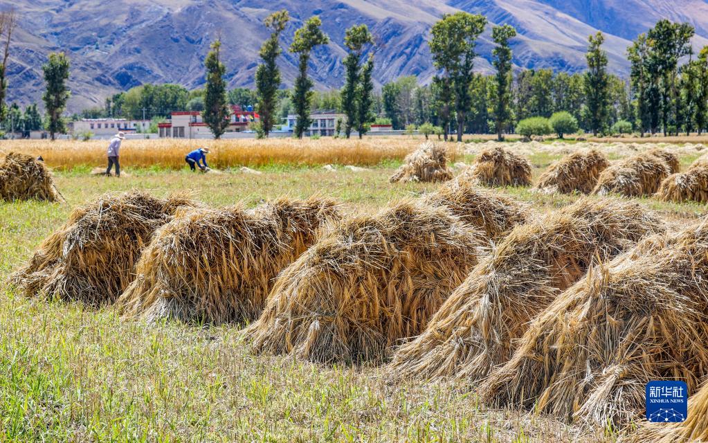 收割工作隊(duì)在林周縣邊林鄉(xiāng)當(dāng)杰村玉沖組搶收小麥(9月6日攝)。新華社記者 姜帆 攝