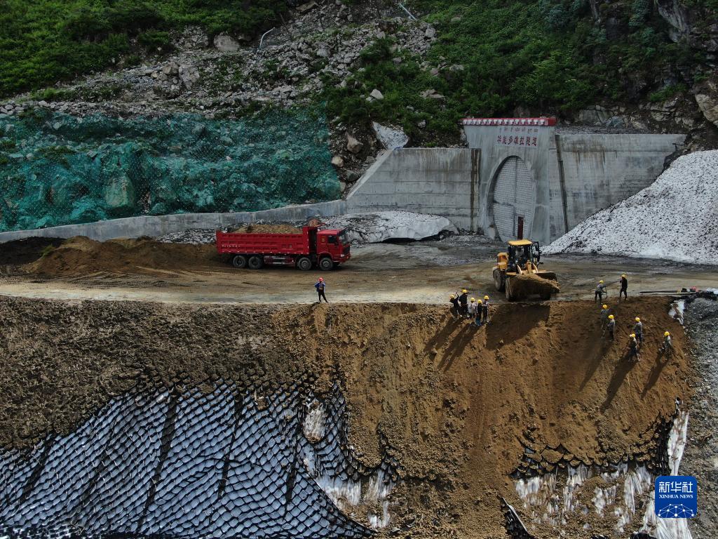 工人在派墨公路多雄拉隧道出口段土工格室高寒邊坡綠化實(shí)驗(yàn)項(xiàng)目現(xiàn)場(chǎng)施工(2020年8月18日攝,無人機(jī)照片)。新華社發(fā)(董志雄 攝)